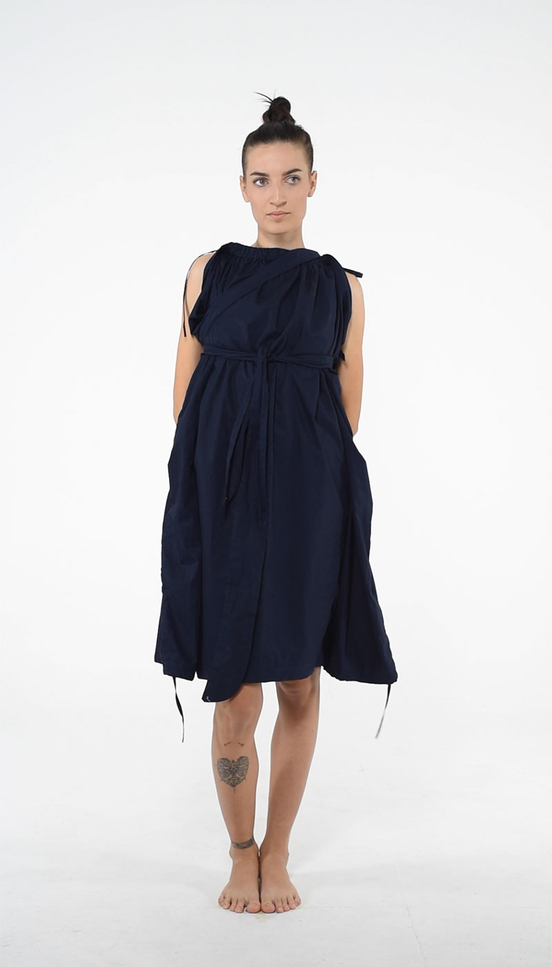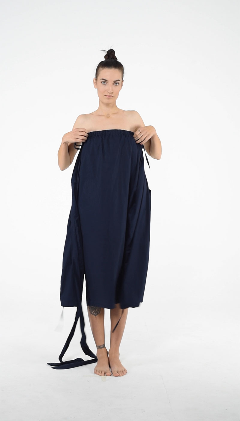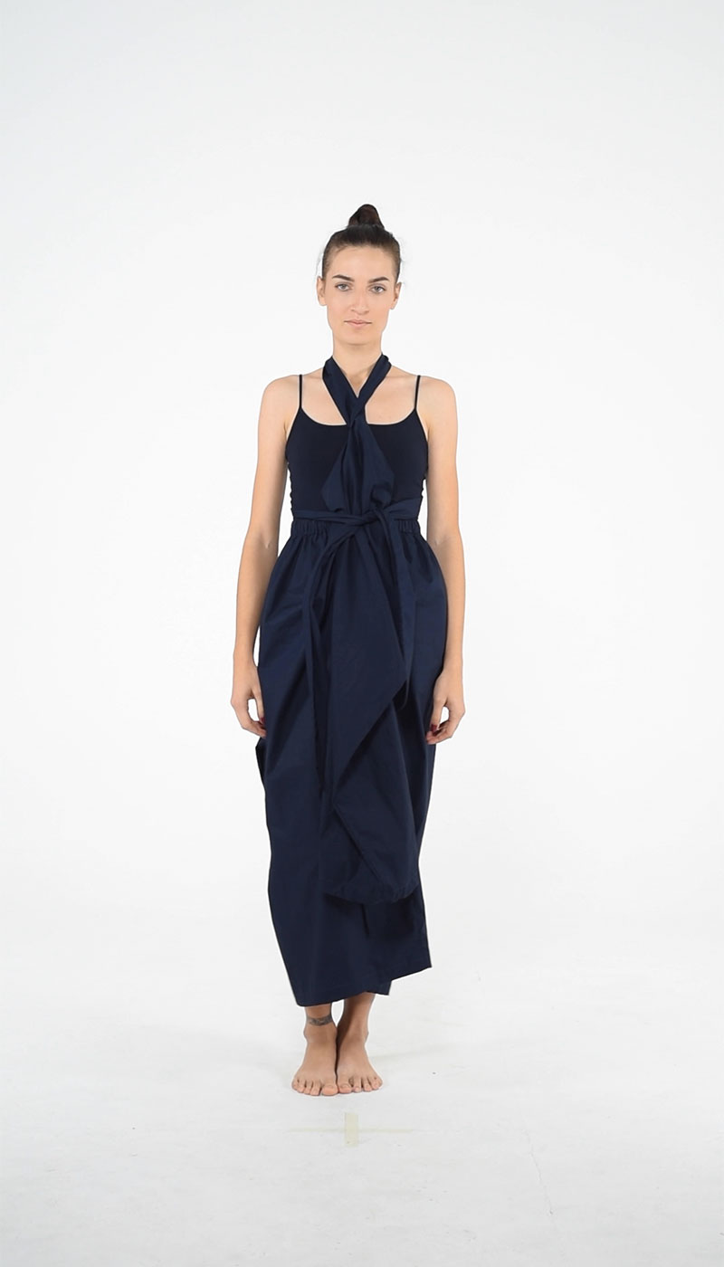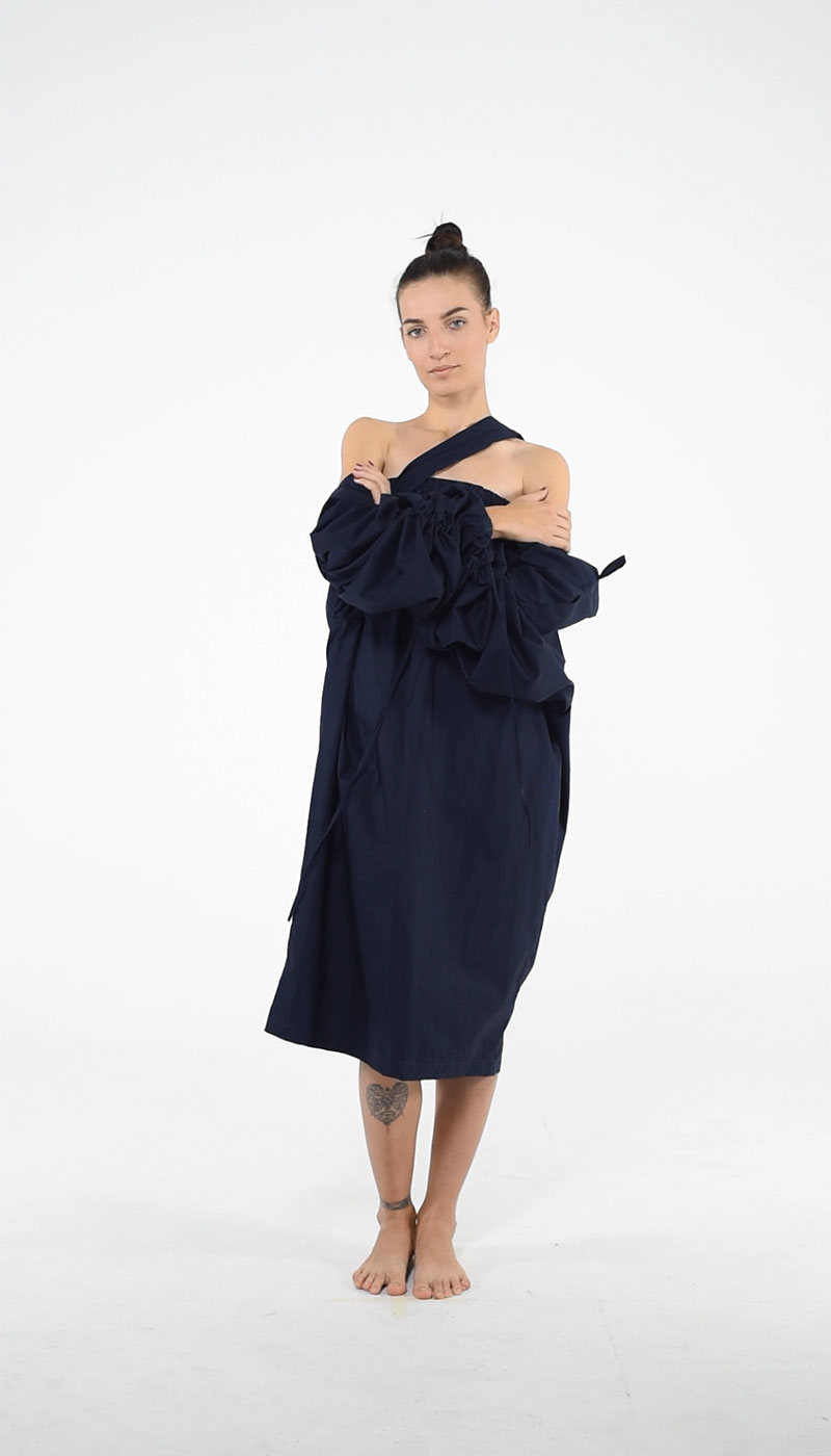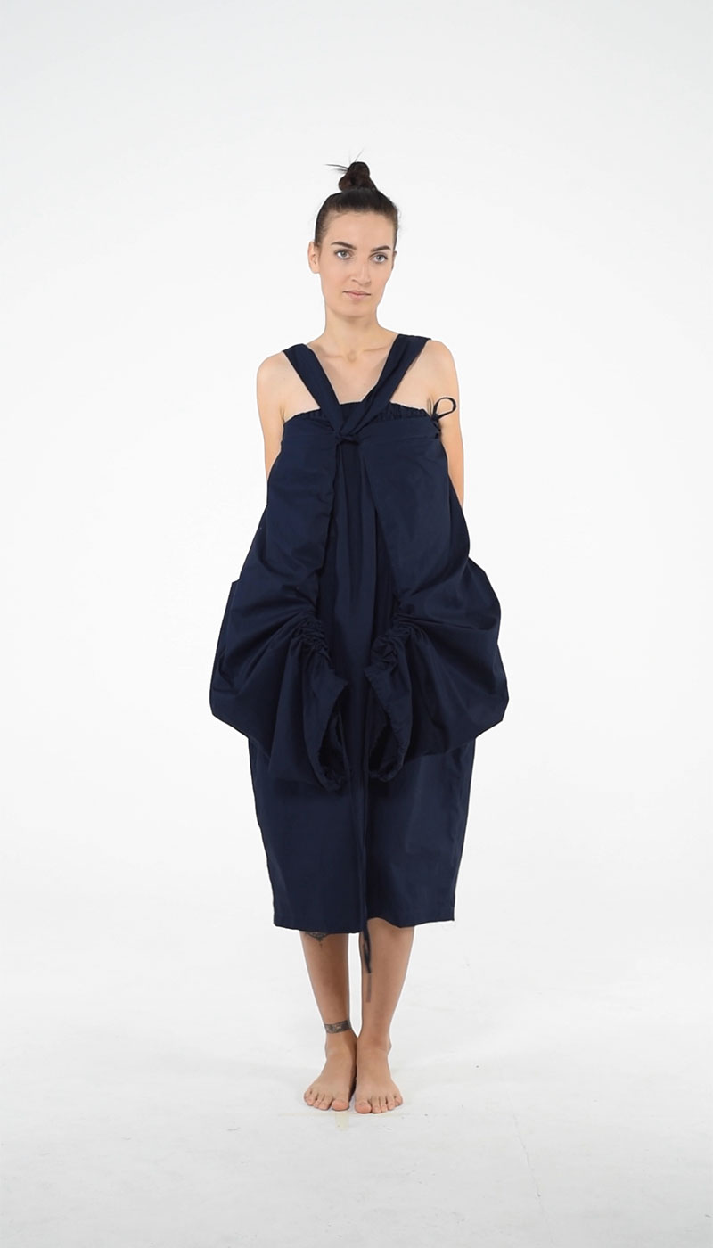 UFOdress® is a piece from the collection Unlimited Fashion Objects, inspired by the art of Július Koller. UFOdress® represents play in fashion and with fashion. It originated in design experiment, seeking greatest variability in wear. UFOdress® can be worn in more than 50 ways, as a dress, pants or skirt; it is a capsule wardrobe, suits all occasions, has an educational aspect, prompts reflection on unnecessary clothes shopping, allows one to find unique variations, and stimulates creativity and the imagination. Its production leaves nearly no waste. The model has been presented at FashionLIVE! 2019, MQ VFW 2020, BADW 2020. It is made from natural materials and appeals to a wide audience, while being continuously developed. UFOdress® is trademarked and listed in the Slovak Design Registry.